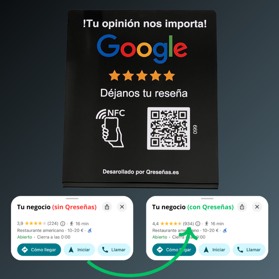 Imagina que María entra en tu negocio, recibe un trato excelente y desea dejar una reseña positiva. Normalmente, el proceso sería largo y complicado, y quizás María olvidaría hacerlo. Pero ahora, con Qreseñas, María simplemente acerca su móvil al expositor en tu mostrador y, en menos de 5 segundos, comparte su opinión en Google. ¡Así de sencillo!
